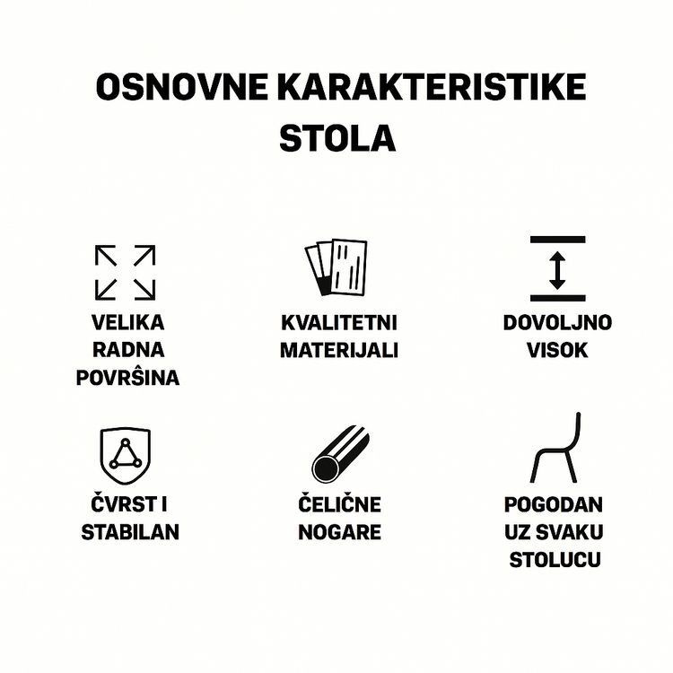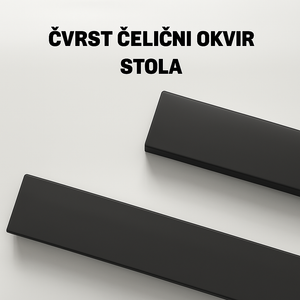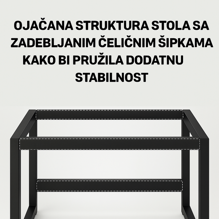 Ojačana struktura stola sa zadebljanim čeličnim sipkama pruža dodatnu stabilnost i sigurnost, dok čvrst čelični okvir stola osigurava dugotrajnost i pouzdanost. Jednostavna montaža omogućava brzo postavljanje stola bez dodatnih problema.