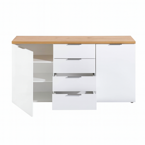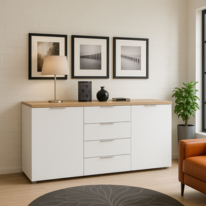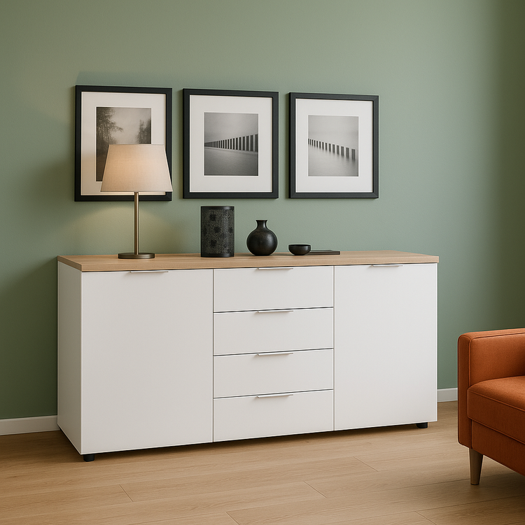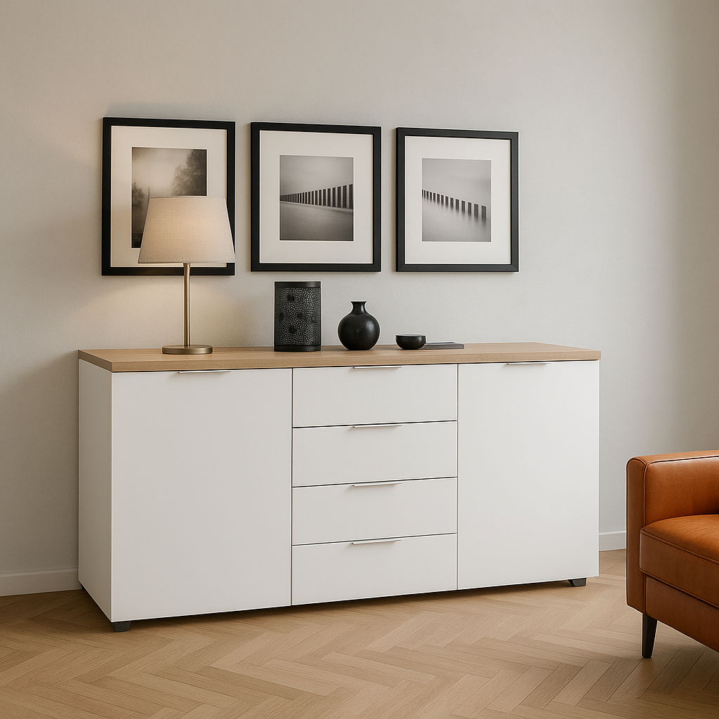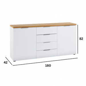 REVO komoda predstavlja savršen spoj savremenog dizajna i praktične organizacije prostora. Sa čistim linijama, bijelim frontovima i gornjom plohom u toploj boji drveta, savršeno se uklapa u moderne dnevne boravke, trpezarije ili kancelarije.