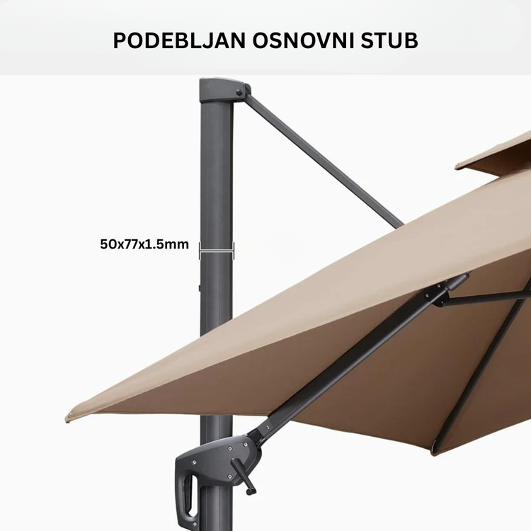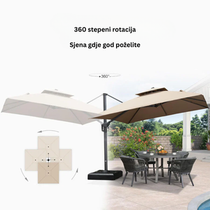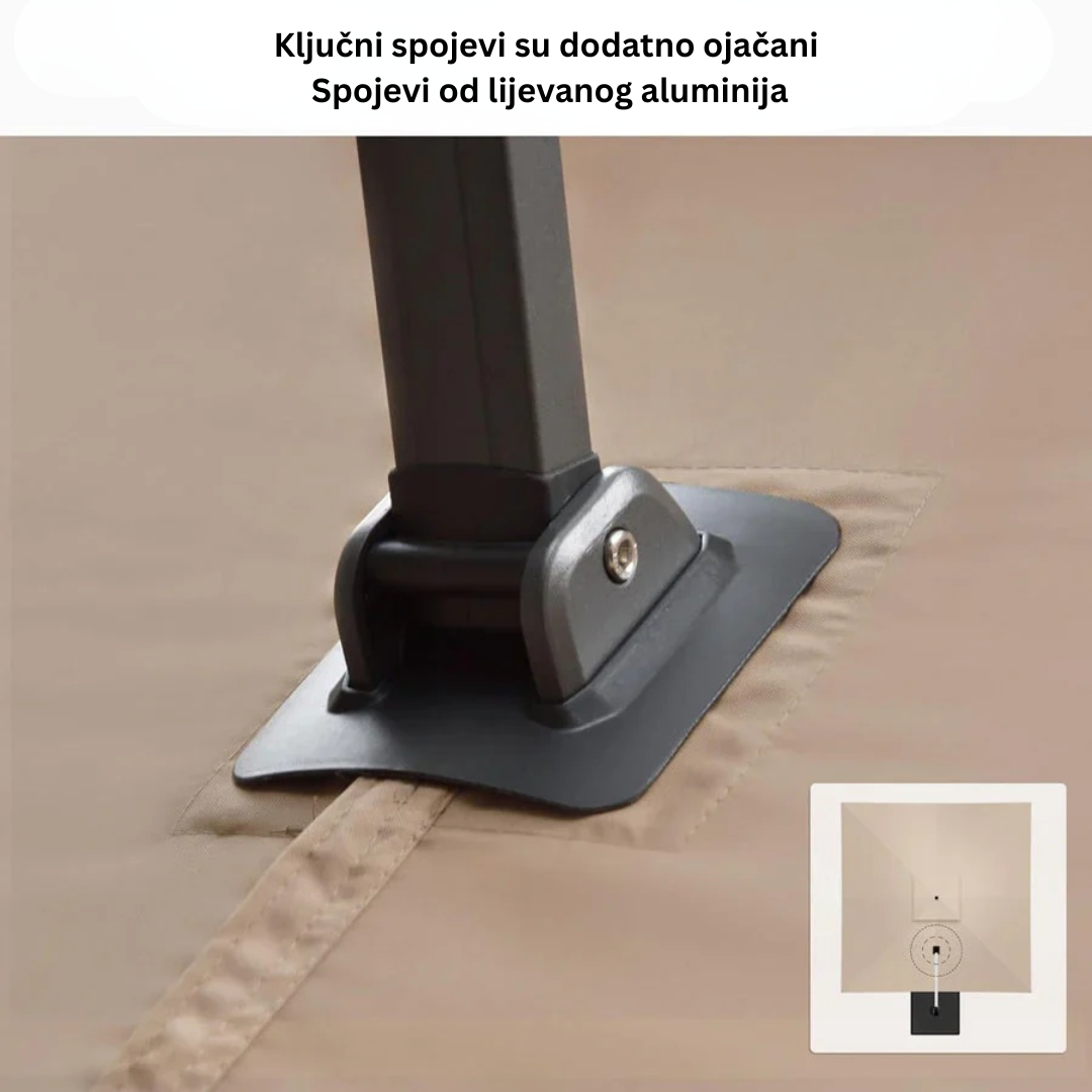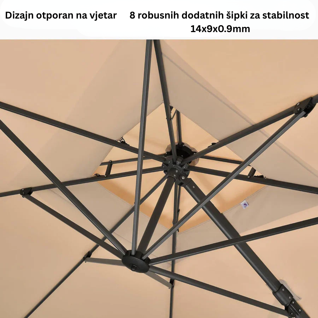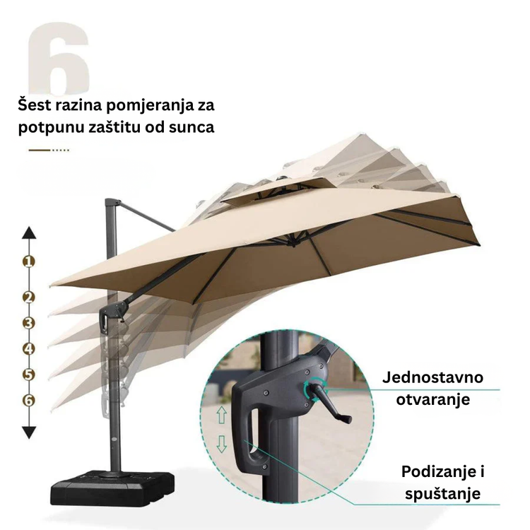 Napomena: Zbog svoje velike površine od 9m kvadratnih, preporučuje se zatvaranje suncobrana tokom ekstremno jakih vjetrova ili nevremena kako bi se produžio vijek trajanja proizvoda.