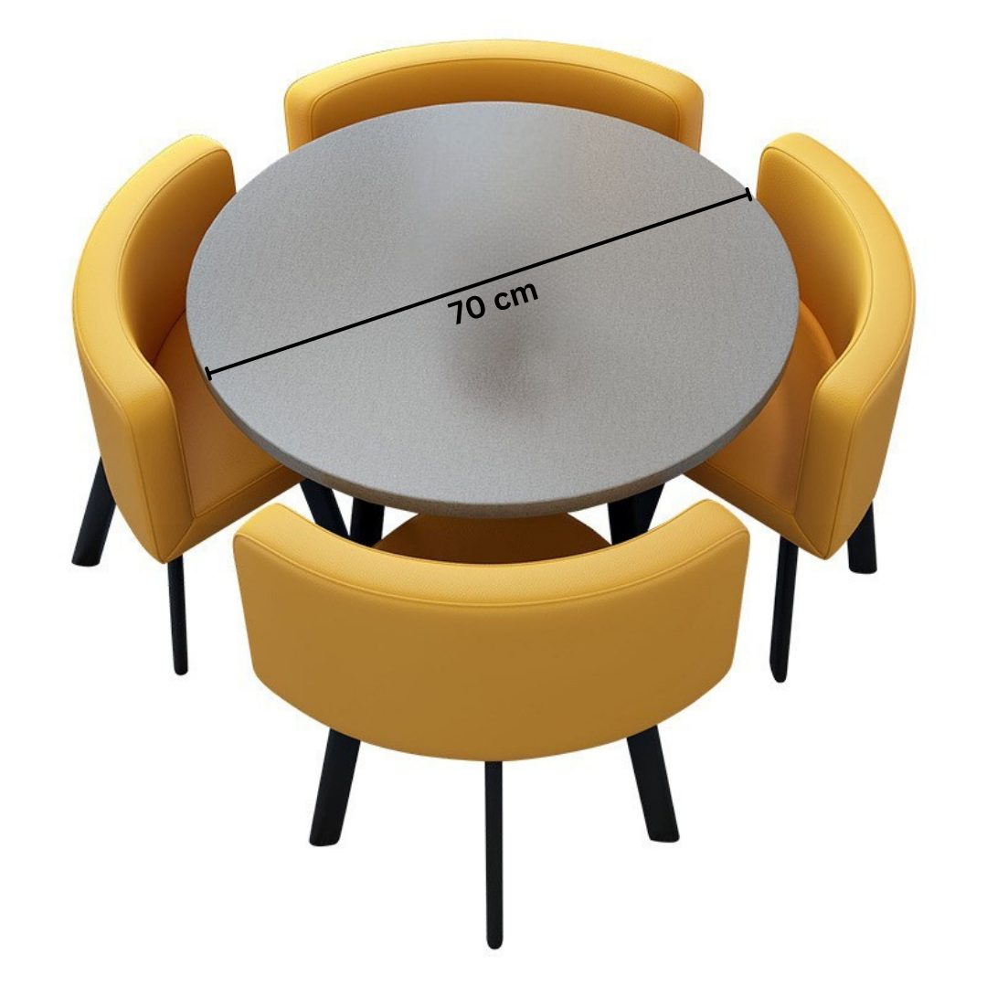 Vladi set je moderan, kompaktan trpezarijski komplet idealan za male prostore. Kombinuje sto 70×70 cm u toplom drvenom dekoru sa 4 smeđe kožne/eko-kožne stolice. Minimalističke linije, udobna sjedišta i stabilne crne noge stvaraju elegantan izgled, dok se sve površine lako održavaju – savršeno za kuhinjske kutke, garsonjere i manje trpezarije.