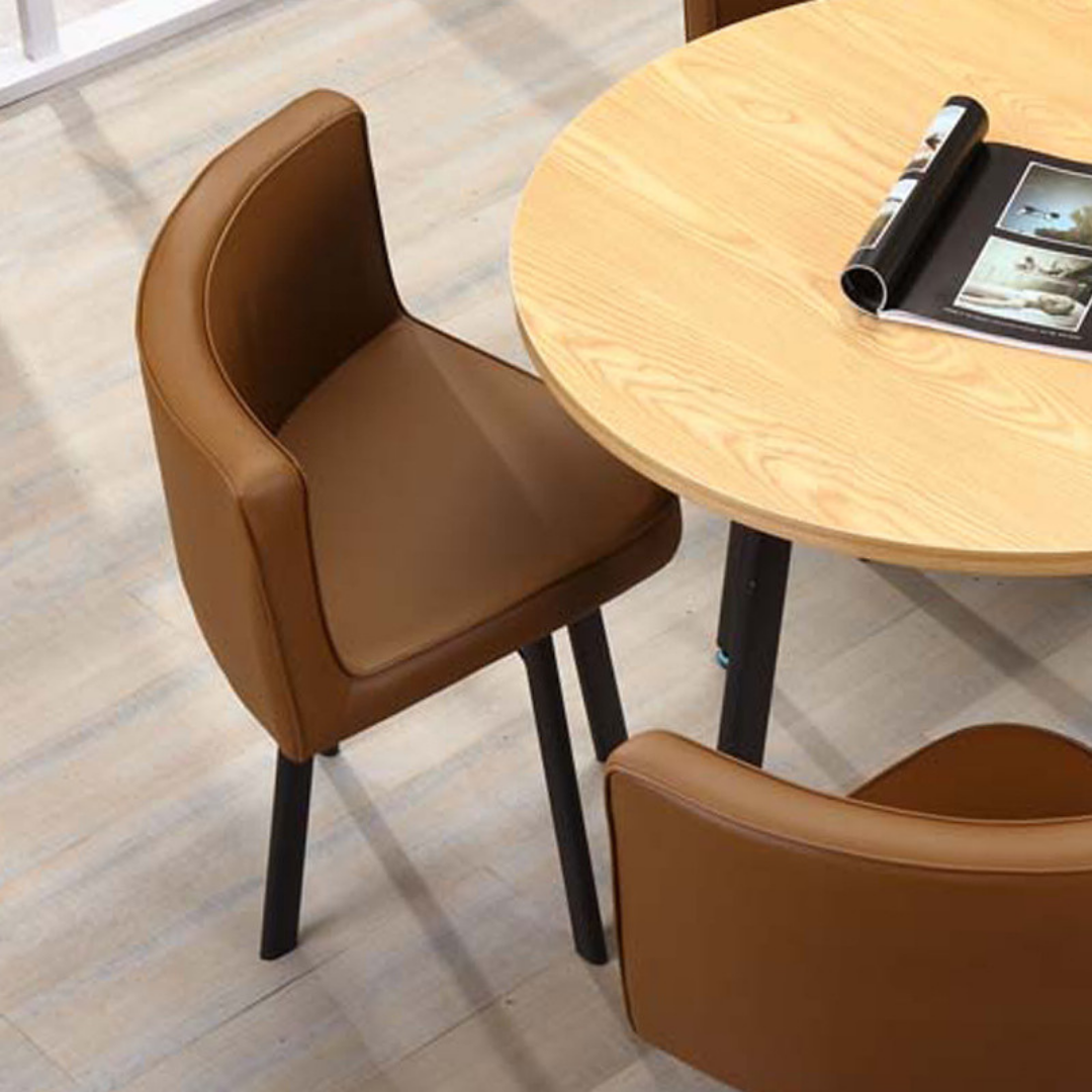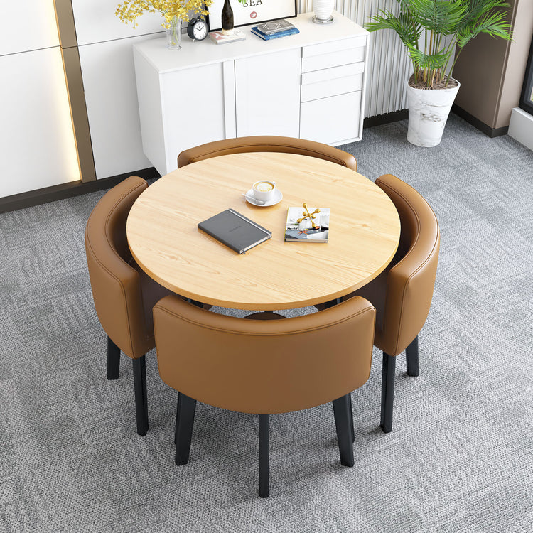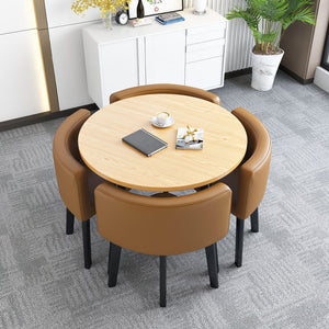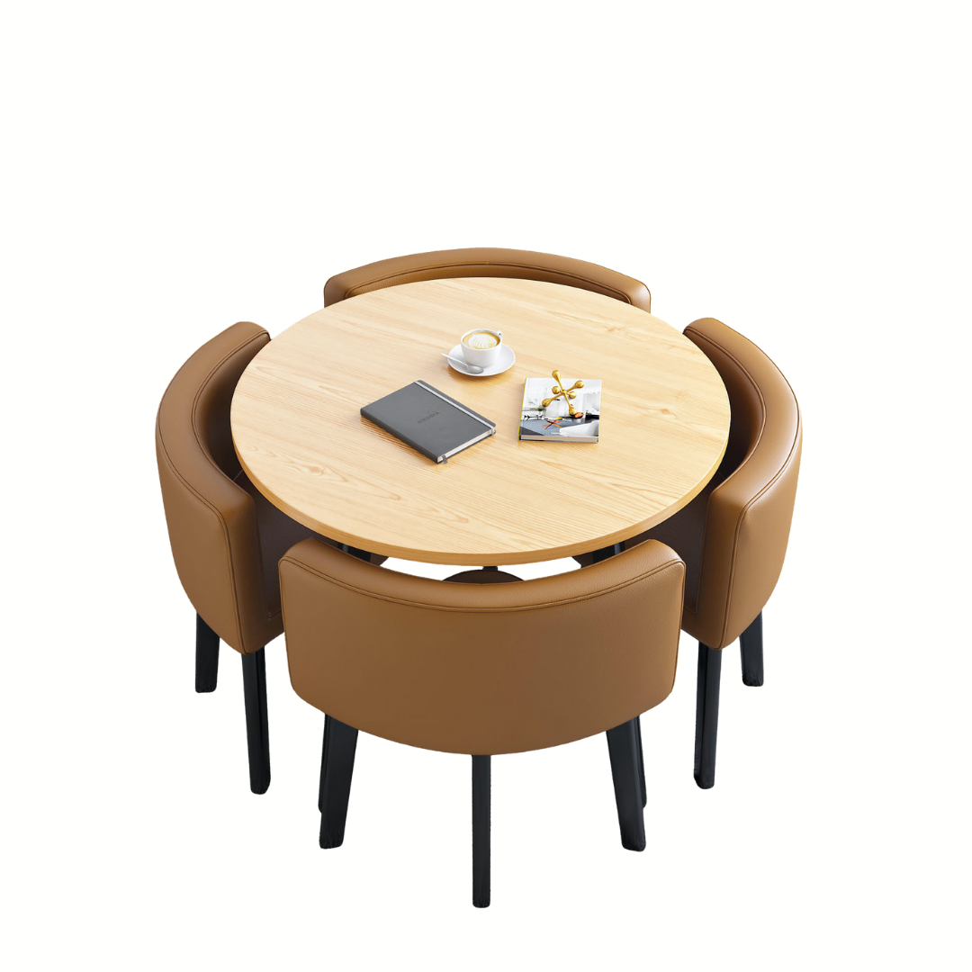 Vladi set je moderan, kompaktan trpezarijski komplet idealan za male prostore. Kombinuje sto 70×70 cm u toplom drvenom dekoru sa 4 smeđe kožne/eko-kožne stolice. Minimalističke linije, udobna sjedišta i stabilne crne noge stvaraju elegantan izgled, dok se sve površine lako održavaju – savršeno za kuhinjske kutke, garsonjere i manje trpezarije.